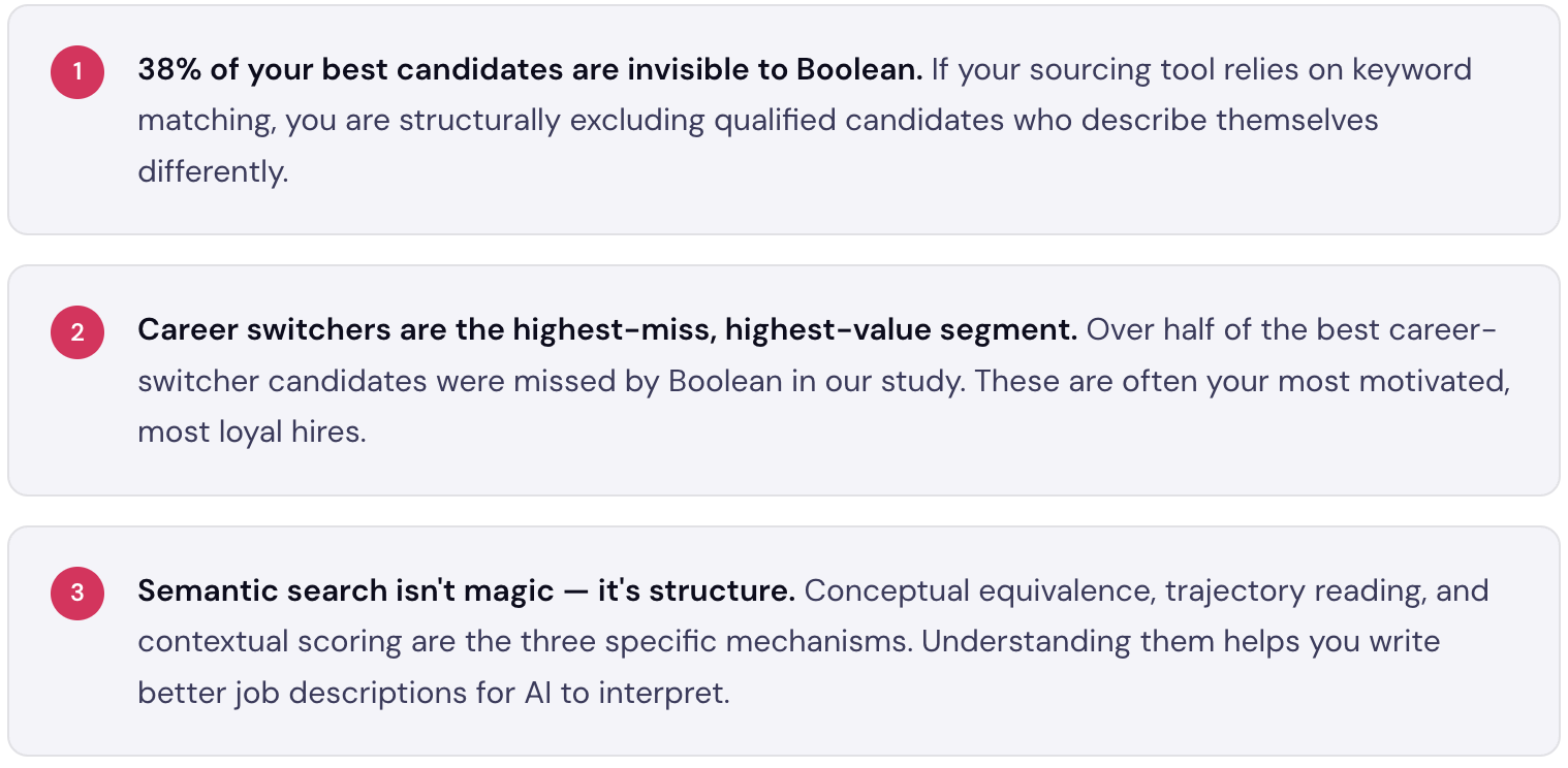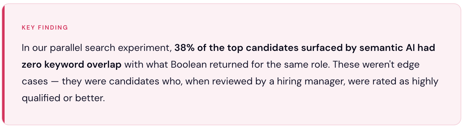 The Boolean result looked right on paper. The semantic result would have been invisible to a traditional search — but turned out to be exactly what the hiring manager wanted. This isn't a cherry-picked edge case. In our dataset, 1 in 3 of the highest-scoring semantic results were invisible to the equivalent Boolean search.