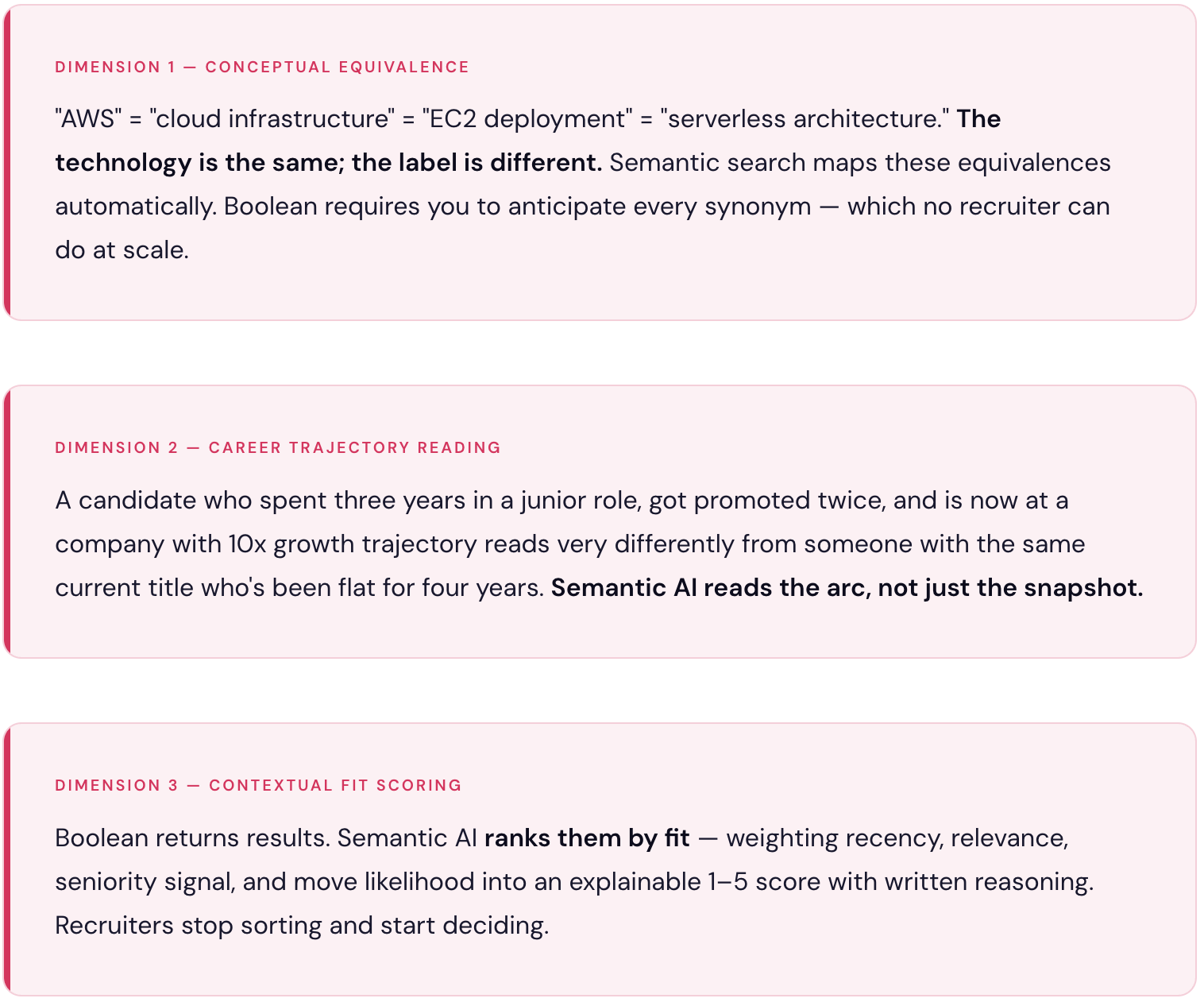 When recruiters hear "semantic AI," it's easy to picture something vague and magical. In practice, it's specific. GoPerfect's semantic search understands three dimensions that Boolean ignores entirely: