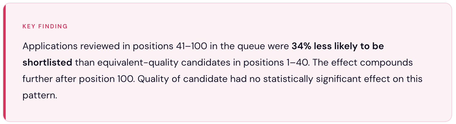 The problem isn't the intent. It's what happens to attention over time. Our data shows that the probability of a qualified candidate being shortlisted drops by 34% after the first 40 applications in a queue — regardless of their actual quality. Not because later applicants are worse. Because recruiter attention isn't constant.