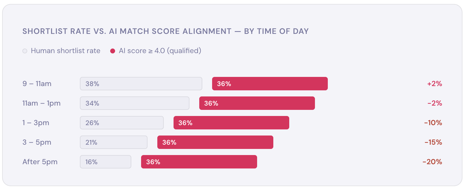 At 9am, human shortlist rates closely tracked AI match scores. By 3pm, the gap was 15 percentage points. After 5pm — when recruiters are often catching up on a backlog — it widened to 20 points. The AI score for the same candidate pool didn't change. The candidate quality didn't change. Only the human reviewer changed.